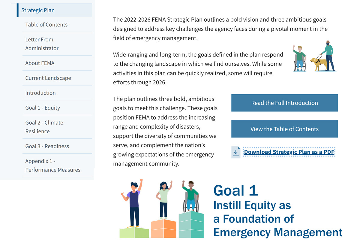 As discussed in the part 2 video, FEMA knows their flood maps are out of date, and that caused many houses to not be considered vulnerable when they actually were. There were many things that FEMA could have done differently, but you know what their priority is? Equity. The following picture is from their website, and the second image is from their Strategic Plan PDF.